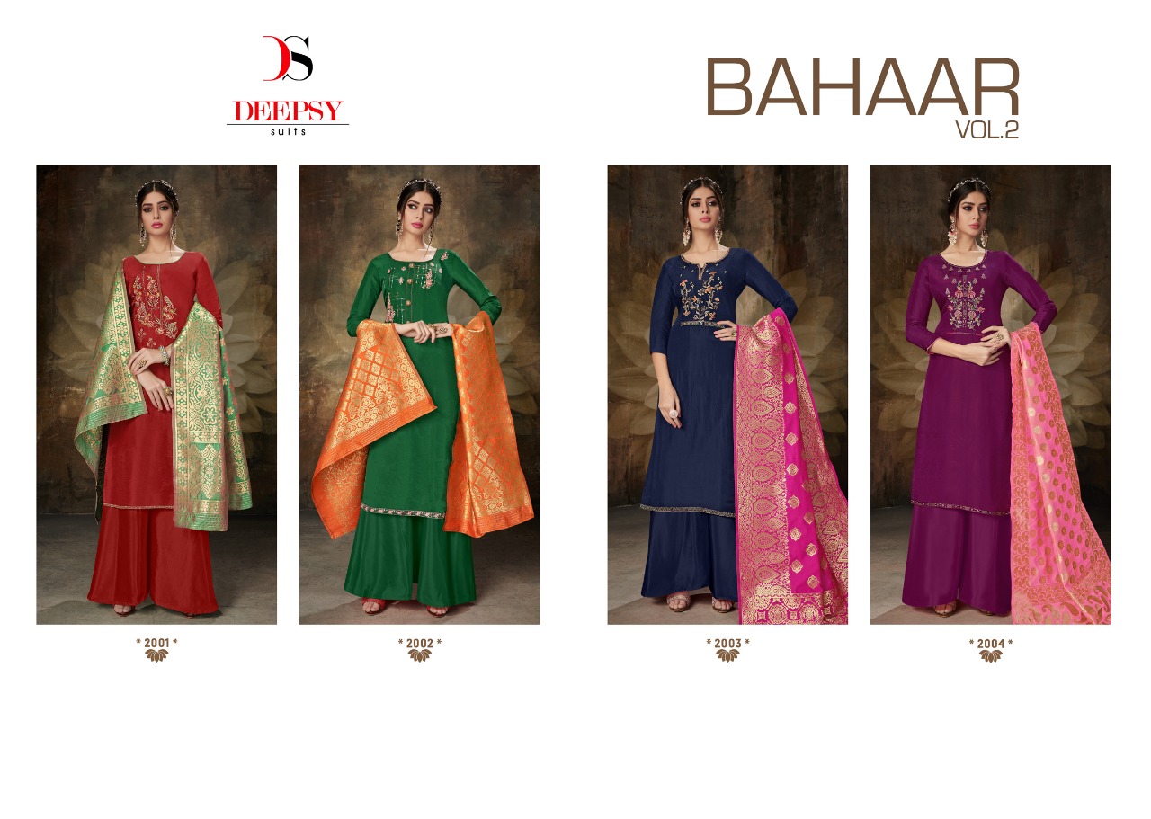 Deepsy suits BAHAAR vol 2 2001-2004 Series ethnic simple elegant look salwar kameez collection With Heavy Print And Texture are New Designs Available With Full and Single Catalog for Wholesaler And Exporter Of Designer Suits & Kurtis, Party Wear Suits , Pakistani Suits , Casual Suits , Bridal Lehenga Choli , Occasional And Festive Ethnic Wear And Indian Wear Dress Code At Best Price In Surat . For More Collection Of STUDIO And Others Brands Like Zoya , Vinay Fashion , LT Nitya , Hotlady , Glossy Simar , Maisha Maskeen, Fiona , Nakkashi , Gulzar , Jinam Floral , Mughda . Mohini Fashion , Leo Fashion, Sybella Creation , Vipul Fashion , Karma Bela Fashion, Arihant ,Zubeda , Mehak , Kimora Heer ,Lavina , Varsiddhi , TFH , Triveni And For Other More Catalogues Please Contact On This Number +91 8347-3656-15 Or Email Us - [email protected]
