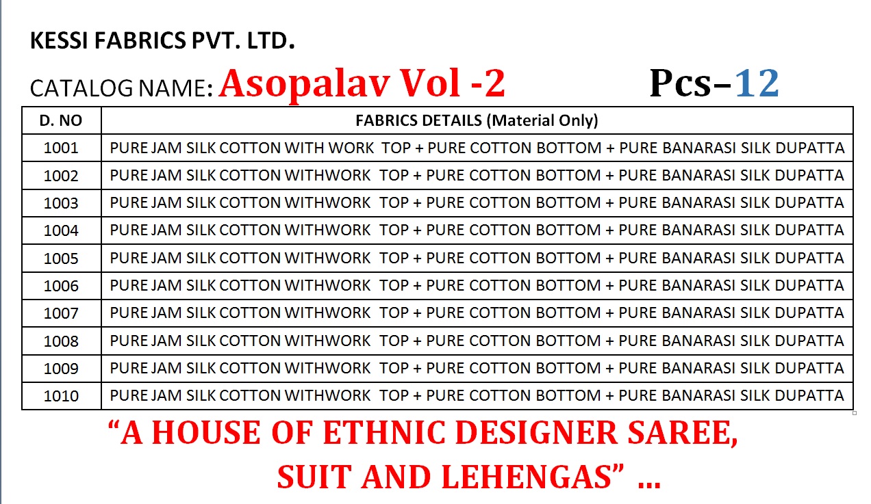 KESSI ASOPALAV VOL 2 JAM SILK SALWAR KAMEEZ WITH BANARASI DUPATTA CATALOG With Heavy Look and Beautiful Embroidery Designer Party Wear Suits Comes With Heavy Lace And Dupatta . KESSI ASOPALAV VOL 2 JAM SILK SALWAR KAMEEZ WITH BANARASI DUPATTA CATALOG are New Designs Available With Full and Single Catalogue KESSI ASOPALAV VOL 2 JAM SILK SALWAR KAMEEZ WITH BANARASI DUPATTA CATALOG are for Wholesaler, Re sellers And Exporter Of Designer Suits , Party Wear Suits , Pakistani Suits , Casual Suits , Bridal Lehenga Choli , Occasional And Festive Ethnic Wear And Indian Wear Dress Code At Best Price In Surat . For More Collection Of KESSI And Others Brands Like Zoya , Vinay Fashion , LT Nitya , Hotlady , Glossy Simar , Maisha Maskeen, Fiona , Nakkashi , Gulzar , Jinam Floral , Mughda . Mohini Fashion , Leo Fashion, Sybella Creation , Vipul Fashion , Karma Bela Fashion, Arihant ,Zubeda , Mehak , Kimora Heer ,Lavina , Varsiddhi , TFH , Triveni And For Other More Catalogues Please Contact On This Number +91 8347-3656-15 Or Email Us - [email protected]