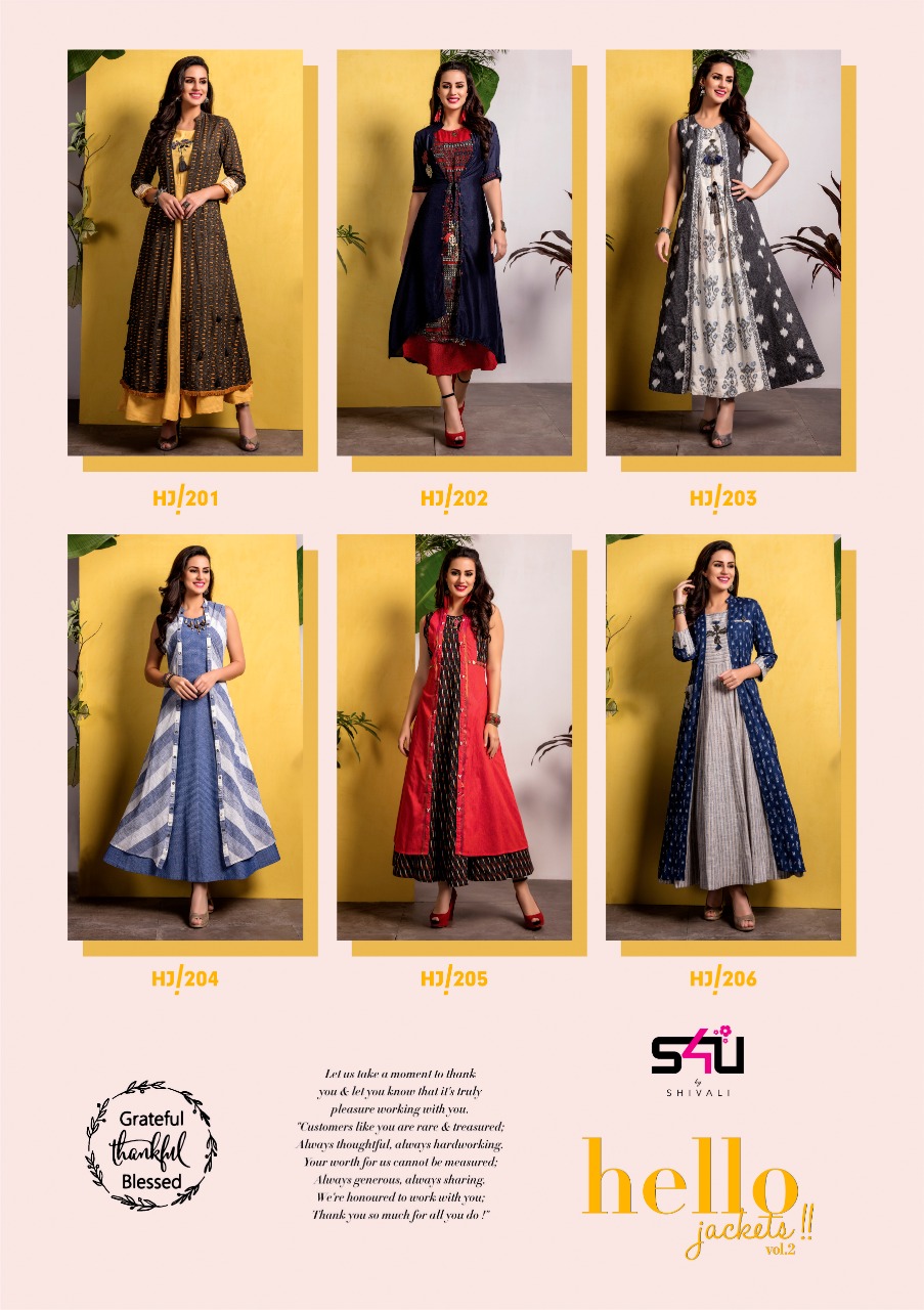 S4U launch Hello jacket vol 2 201-206 Series special festive season collection of Kurtis collection wholesalers in surat concept With Heavy Print And Texture are New Designs Available With Full and Single Catalog for Wholesaler And Exporter Of Designer Suits & Kurtis, Party Wear Suits , Pakistani Suits , Casual Suits , Bridal Lehenga Choli , Occasional And Festive Ethnic Wear And Indian Wear Dress Code At Best Price In Surat . For More Collection Of STUDIO And Others Brands Like Zoya , Vinay Fashion , LT Nitya , Hotlady , Glossy Simar , Maisha Maskeen, Fiona , Nakkashi , Gulzar , Jinam Floral , Mughda . Mohini Fashion , Leo Fashion, Sybella Creation , Vipul Fashion , Karma Bela Fashion, Arihant ,Zubeda , Mehak , Kimora Heer ,Lavina , Varsiddhi , TFH , Triveni And For Other More Catalogues Please Contact On This Number +91 8347-3656-15 Or Email Us - [email protected]