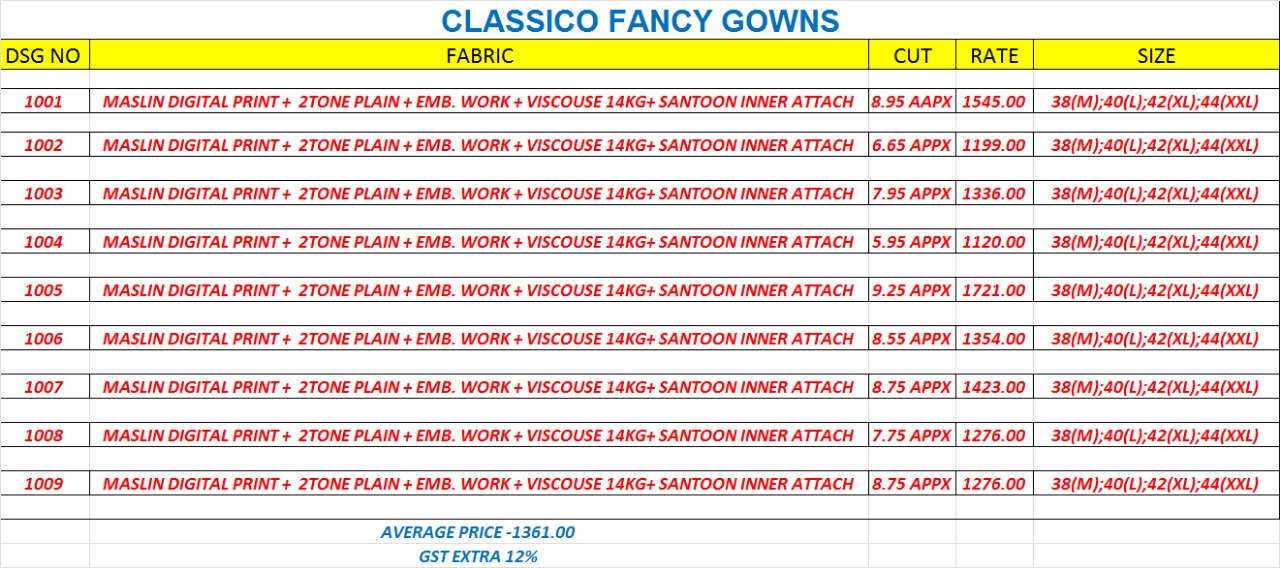 Tunic house classico 1001-1009 Series 12249 + 5% GSt Extra long flair party wear gowns catalog collection dealer With Heavy Print And Texture Are New Designs Available With Full And Single Catalog For Wholesaler And Exporter Of Designer Suits & Kurtis, Party Wear Suits , Pakistani Suits , Casual Suits , Pakistani Salwar Suits, Bollywood Designer Lehenga Choli, Low Price Cotton Printed Salwar Kameez, Wholesale Sarees Catalogue,Ethnic Wear For Women ,S4U Kurtis Catalogue , Designer Kurtis Wholesale,Dress Material Wholesale,Bridal Lehenga Choli , Occasional And Festive Ethnic Wear And Indian Wear Dress Code At Best Price In Surat . For More Collection Of Studio And Dealing In All Major Brands From Surat Like Aashirwad , Alok Suits , Amirah , Angroop Plus , Arihant Designer , Avc , Balaji Cotton , Bela , Belliza , Cosmos , Cygnus , Deepsy , Deeptex , Diksha , Diya Trendz , Eba , Fairlady , Fepic , Fiona. , Four Button , Ganga , Gulzar , Hansa , House Of Lawn , Inaya , Ishaal Prints , Jinaam Dresses, Jk Cotton , Juvi Fashion , Kajal Style , Kajree Fashion , Kalarang , Kapil Kap , Karachi Suits , Karma Trendz , Kesari Trendz , Kessi Fabrics , Kiana Kurti , Kimora Fashion , Krishriyaa , Levisha , Lt Fabrics , Lymi , M3 Fashion , Maisha , Manas Kurti , Mcm Lifestyle , Meera Trendz , Mesmora , Mf , Mrigya , Mittoo Kurti , Mohini Fashion , Moof Fashion, Mugdha , Mumtaz Arts , Psyna Tex , Radhika Fashion , Rangoon , Rani Trendz , Rsf , Rupali Trendz , Rr Fashion , Rvee Gold , S4U , Sahiba , Sajawat Creation , Samaira Fashion , Sargam Prints , Shahnaz Arts , Shraddha Designer , Shree Fabs , Seriema , Sybella , Tanishk Fashion , Tunic House , Twisha , Vasanche , Viksit Fab , Vinay Fashion , Vink Kurti , Vipul Fashion , Volono Trendz , Vf Kurti , Your Choice , Zs Textile , Zubeda Zoya , Vinay Fashion Wholesale, Lt Nitya , Hotlady , Glossy Simar , Deepsy Suit ,Maisha Maskeen, Fiona , Nakkashi , Gulzar , Jinam Floral , Mugdha Suits , Mohini Fashion , Leo Fashion, Sybella Creation , Vipul Fashion , Karma Bela Fashion, Arihant ,Zubeda , Mehak , Kimora Heer ,Lavina , Varsiddhi , Tfh , Triveni And For Other More Catalogues Please Contact On This Number +91 8347-3656-15 Or Email Us - [email protected]